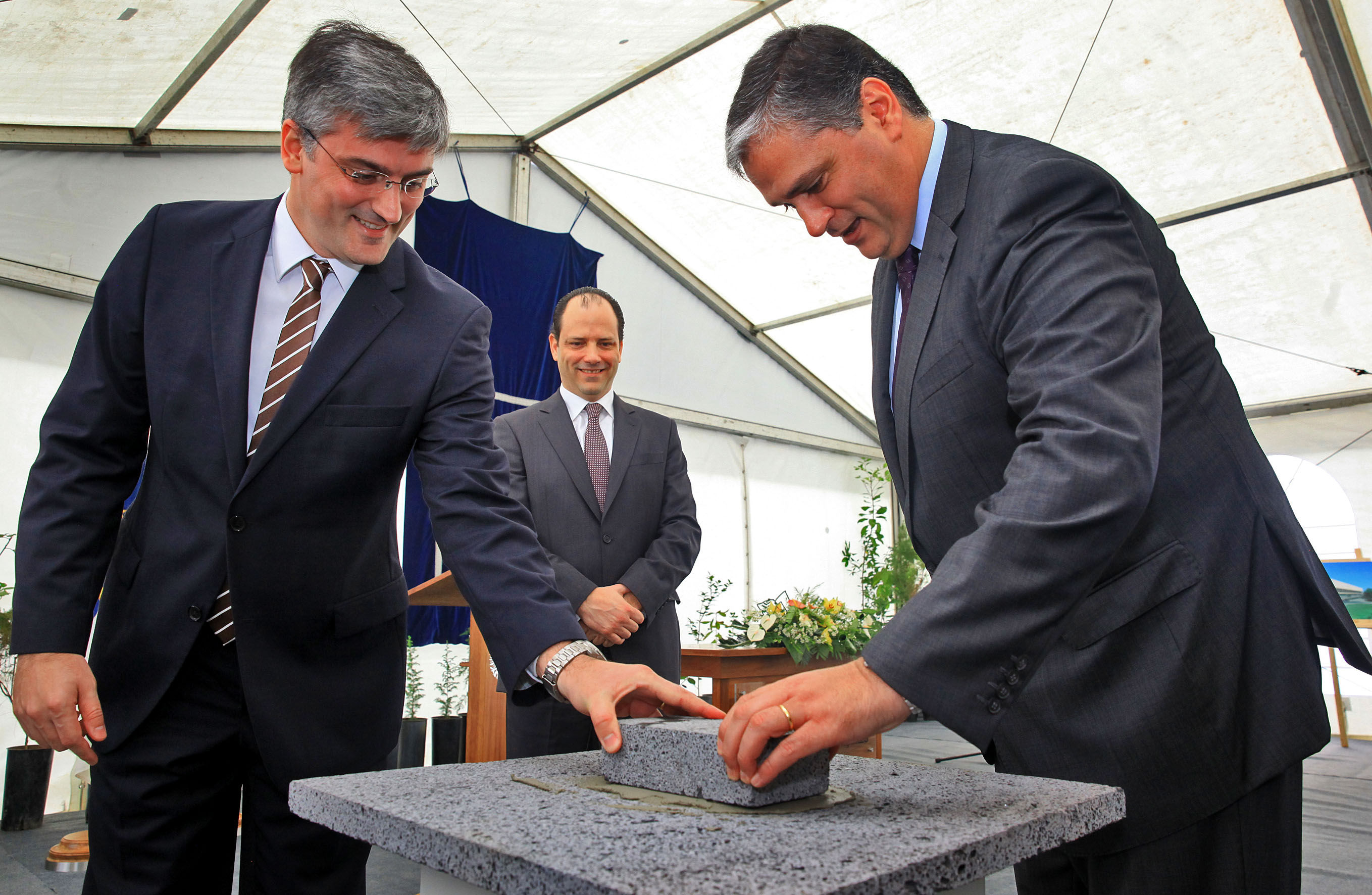 O Presidente do Governo, acompanhado pelo Secretário Regional da Saúde, no lançamento da pedra fundamental, do Centro de Saúde de Ponta Delgada