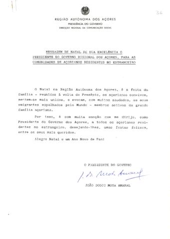 Mensagem de Natal de sua Excelência o Presidente do Governo Regional dos Açores, para as Comunidades de Açorianos residentes no estrangeiro