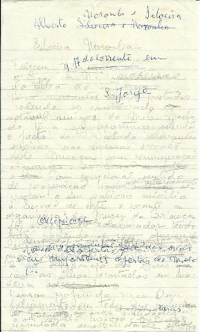 Contém texto que aparenta ser um pequeno discurso ou dedicatória ao Sr. Alberto de Noronha e Silveira. Destaca as suas qualidades e trabalho voluntário e precioso na SC de Arte e na criação do Museu da Criança. Este texto está escrito a lápis, mas no verso há várias anotações, que nada têm a ver com este falecimento, a tinta preta e outras a azul. Contém, também, um pequeno cartão ilustrado com a representação de São Miguel (?) que no verso tem a anotação de que esta imagem é a pintura do baixo-relevo em pedra da entrada do Museu oferecido pelo Sr. Noronha e Silveira. Há, ainda, um cartão que assinala a morte deste com fotografia, datas de nascimento e morte e uma oração.