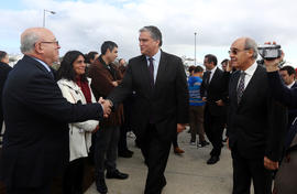 Registo fotográfico do Presidente do Governo Regional dos Açores, Vasco Cordeiro, acompanhado pelo Secretário Regional da Educação, Ciência e Cultura, e pelo Presidente da Câmara Municipal de Lajes do Pico, na visita ao exterior do edifício da Escola da Ponta da Ilha, na Freguesia de Piedade, Concelho de Lajes do Pico.