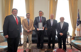 Registo fotográfico do presidente e do Secretário-Geral da ECTAA, assim como o Presidente da Associação Portuguesa das Agências de Viagens e Turismo, em audiência, com o presidente do Governo Regional, no Palácio de Sant`Ana, em Ponta Delgada.