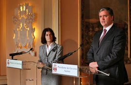 Registo fotográfico do Presidente do Governo Regional, Vasco Cordeiro, e a Diretora Regional do Serviço de Estrangeiros e Fronteiras, Ana Gabriela Parreirão, em declarações aos órgãos de Comunicação Social, após audiência, no Palácio de Santana, em Ponta Delgada.