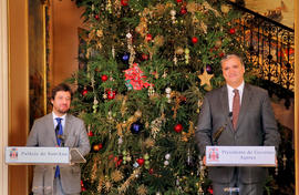 Registo fotográfico do Presidente do Governo Regional, Vasco Cordeiro e do Ministro da Defesa Nacional, José Pedro Aguiar Branco, em declarações aos órgãos de Comunicação Social, após audiência, no Palácio de Santana, em Ponta Delgada.