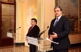 Registo fotográfico do presidente do Governo Regional, Vasco Cordeiro e do Vice-Presidente, Sérgio Ávila, em declarações aos órgãos de comunicação social, após audiência, durante a tarde com os representantes do PPM, do PCP, do BE, do CDS/PP, do PSD e do PS, no âmbito do processo de auscultação sobre as antepropostas de Orçamento Regional e Plano Anual para 2014, no Palácio de Santana, em Ponta Delgada.