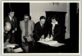 Fotografia que capta o momento da assinatura do Presidente do Governo Regional, Mota Amaral, aquando da cerimónia da tomada de posse do I Governo Regional.