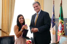 Atleta Carolina Bento, campeã mundial de Karaté acompanhada pelo treinador, Fernando Vicente, em audiência, com o presidente do Governo Regional