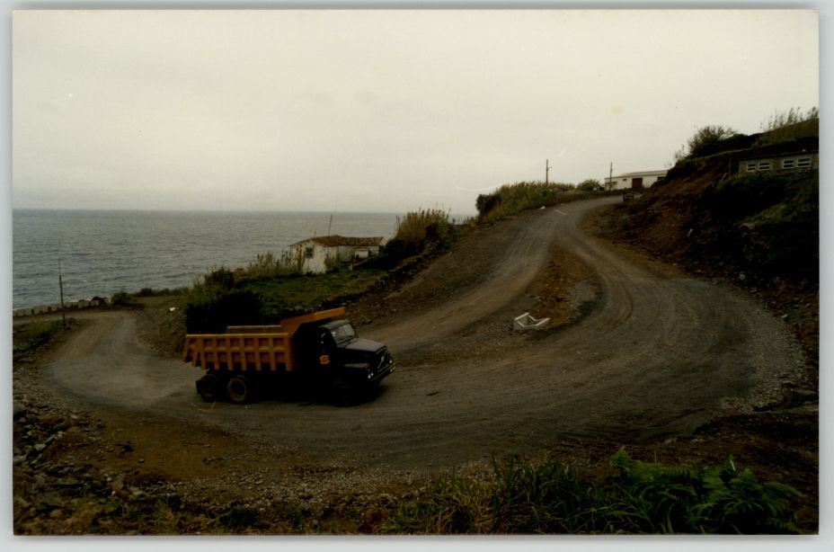 Na fotografia é visível as obras de construção do Porto das Lajes das Flores. A imagem destaca as obras de acesso ao porto.