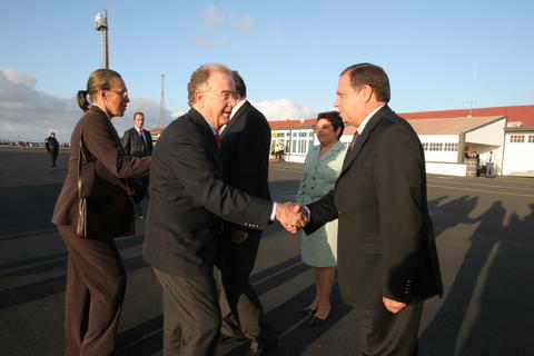 Registo fotográfico do presidente da República, Jorge Sampaio, acompanhado pela sua esposa, Maria José Ritta, à chegada à ilha de Santa Maria, no âmbito das “Jornadas do Turismo”. Foram recebidos pelo presidente do Governo Regional, Carlos César, e pela presidente da Câmara Municipal de Vila do Porto, Nélia Maria Coutinho Figueiredo, que os acompanharam na visita à ilha de Santa Maria.