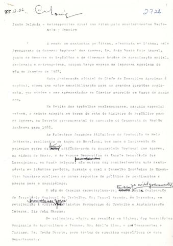 Nota de imprensa com o resumo dos principais acontecimentos políticos de 1986, subdividida por meses e enviado à Comunicação entre 6 e 29 de dezembro de 1988. Ao longo da retrospetiva são referidos marcos importantes como as eleições para a Assembleia Regional dos Açores, várias visitas estatutárias e a integração das Regiões Atlânticas na Europa Comunitária.
