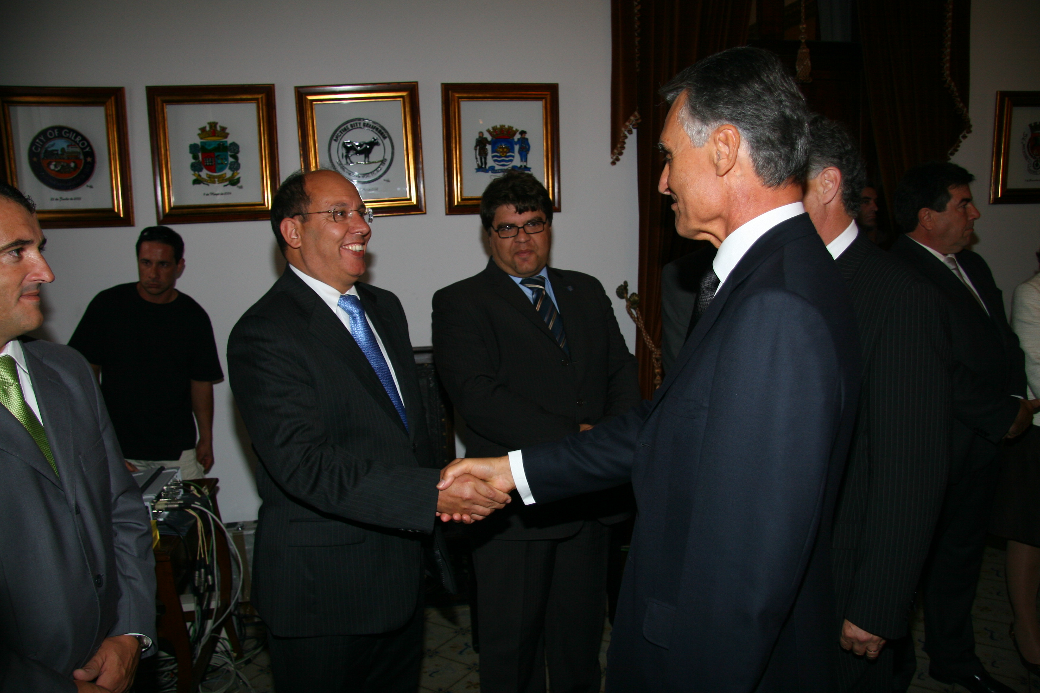 Esta fotografia foi captada o momento em que o presidente da República cumprimenta o presidente da Câmara Municipal do Nordeste, José Carlos Carreiro, no Salão Nobre da Câmara Municipal de Angra do Heroísmo, aquando da sua visita oficial do aos Açores.