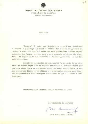 Mensagem de reconhecimento sobre a criação da iniciativa literária "Imagens", por parte do Presidente do Governo, Dr. João Bosco Mota Amaral
